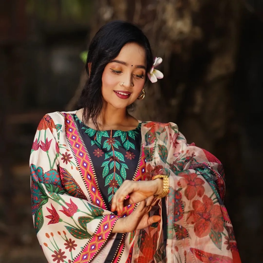 এই থ্রি-পিসটি তৈরি করা হয়েছে উন্নত মানের Sensitive Silk Fabric দিয়ে, যা দেখতে প্রিমিয়াম এবং পরতে অত্যন্ত আরামদায়ক। ডিজিটাল প্রিন্ট কাজের কারণে ড্রেসটি হয়ে উঠেছে আরও আকর্ষণীয় ও ট্রেন্ডি।